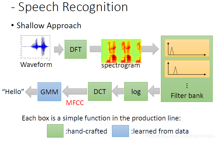 比如说,在声音识别里面,还没有用deep learning 的时候,怎么做呢?现有一段声音信号,然后先做DFT,变成spectrogram,然后再做Filter bank,再取log,然后再做DCT,得到MFCC,再把MFCC丢掉GMM里面,得到结果。在整个生产线上面呢,只有最后的GMM是由training data学出来的,其他的都是手工做的。其他的部分都是古圣先贤花了好几十年研究出来的。