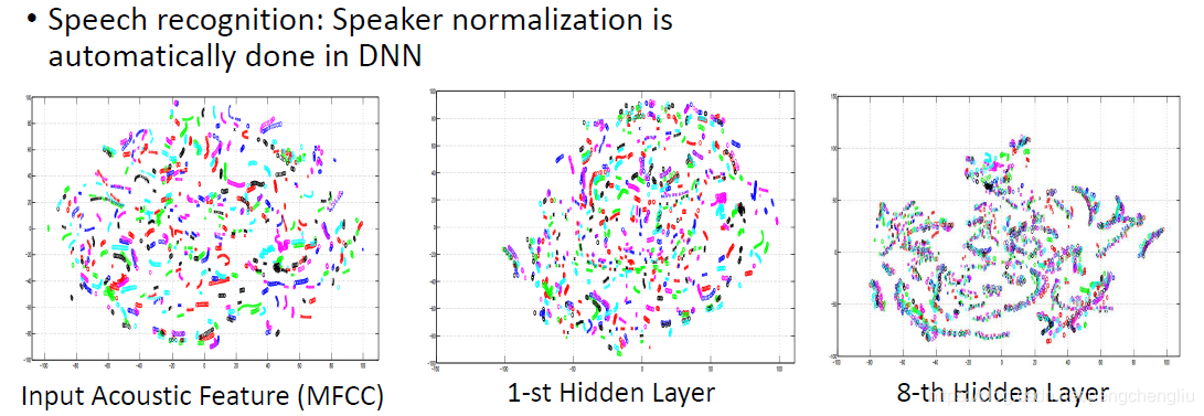 deep learning还有什么好处呢? 通常我们task,是非常复杂的。有时候非常像的input,会有很不一样的output。比如白色的狗和北极熊看起来很像,但是output不一样。有时候非常不一样的东西,看起来是一样的。比如下面两个都是火车。 如果,网络只有一层的话,只能做简单的transform,没有办法把一样的东西变成不一样,没法把不一样的东西变得很像。 要让原来input很不一样的东西变成一样,需要做很多层次的转换。举例来说,看下面的例子。这来自12年的一篇文章。做的事情是,把MFCC投影到二维平面上,不同颜色代表不同人说的话。这些人说的话是一样的。看左图,同样的句子,不同的人说声音信号很不一样。如果今天learn 一个神经网络,只看第一层的hidden layer的output,你会说不同的人说的同一个句子还是很不一样。但是如果看第8个隐藏层的输入的话,会发现不同人说的同一个句子在一起了。也就是说,dnn在转换的时候把本来看起来很不像的东西,就把他们连在一起了。本来很不像,经过8个layer的变换以后,就变得很像了。