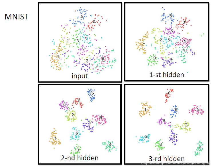 刚才是语音的例子,如果用手写数字辨识的例子,输入是这样。如果把28*28的像素投影到二维平面的话,看起来是input这样。你会发现4跟9几乎是叠在一起的。几乎没有办法分开。第一个隐藏层的output,还是很像,没有分的太开。看第二个hidden layer,会发现逐渐分开。第三个分的更开。所以要让本来看的很像的分的很开,也需要好多层才能办到这件事。