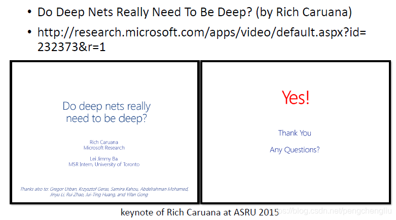 其实还有更多,用deep learning的理由了。比如这个人,第一个PPT是Do deep net really need to be deep?第二页PPT就写了个yes,然后留了很多时间让大家问问题。哈哈