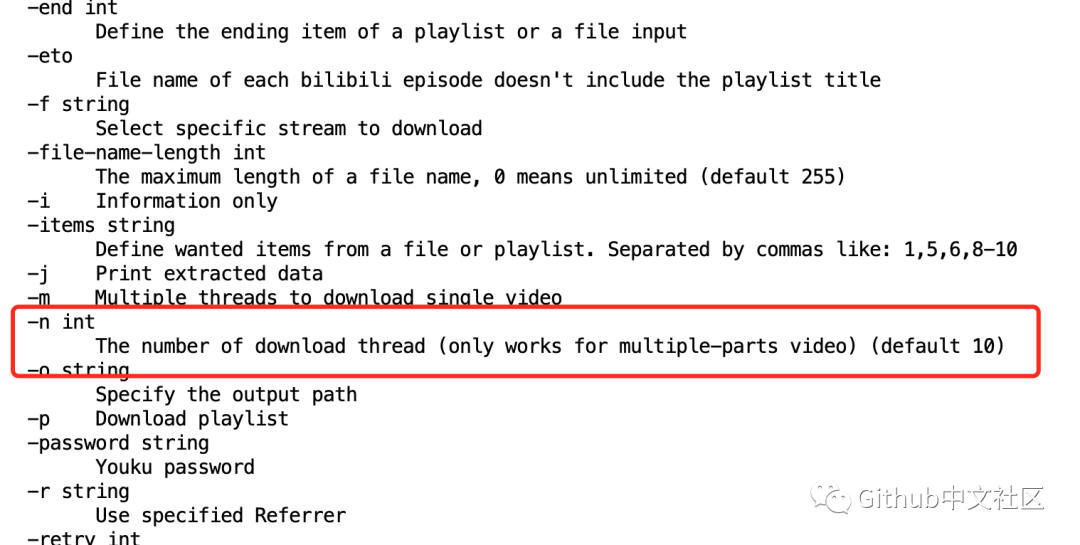 可以通过 annie -h 这个命令查看参数,这里就看一下大家最关心,也是最实用的一个:线程数, 默认是开启10个线程,只要电脑配置跟得上,童鞋们开100个线程都行????????