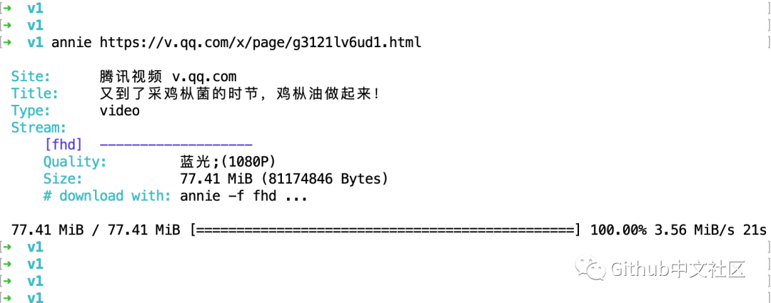 annie + 视频地址 然后回车就完事了,下载过程中命令行中会显示视频的一些基本信息: