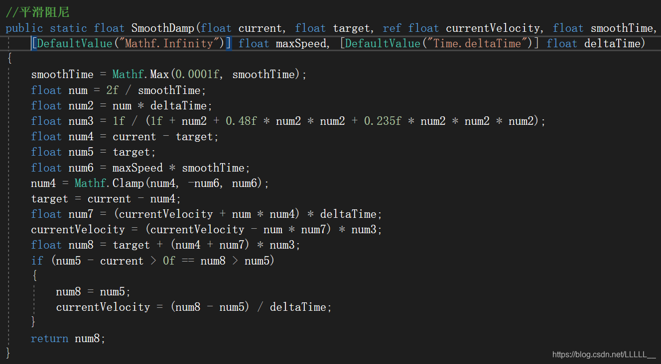 ——SmoothDamp:平滑阻尼移动,与Lerp效果类似(先快后慢),只不过效果更加平滑,常用于相机跟随操作