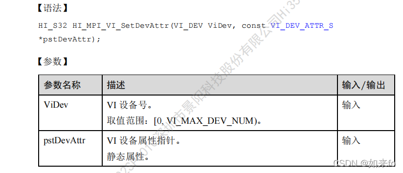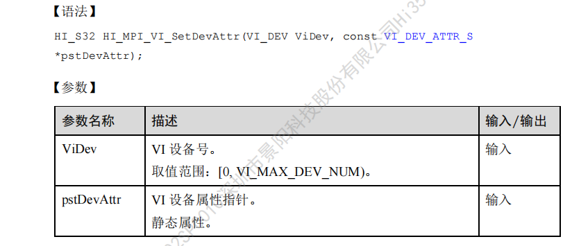 GK_ADP_COMM_VI_GetDevAttrBySns(enSnsType, &stViDevAttr); //获得dev0的属性 GK_API_VI_SetDevAttr(ViDev, &stViDevAttr); /*设置 VI 设备属性。基本设备属性默认了部分芯片配置,满足绝大部分的 sensor 对接要 求。*/ GK_API_VI_EnableDev(ViDev); //启用vi设备