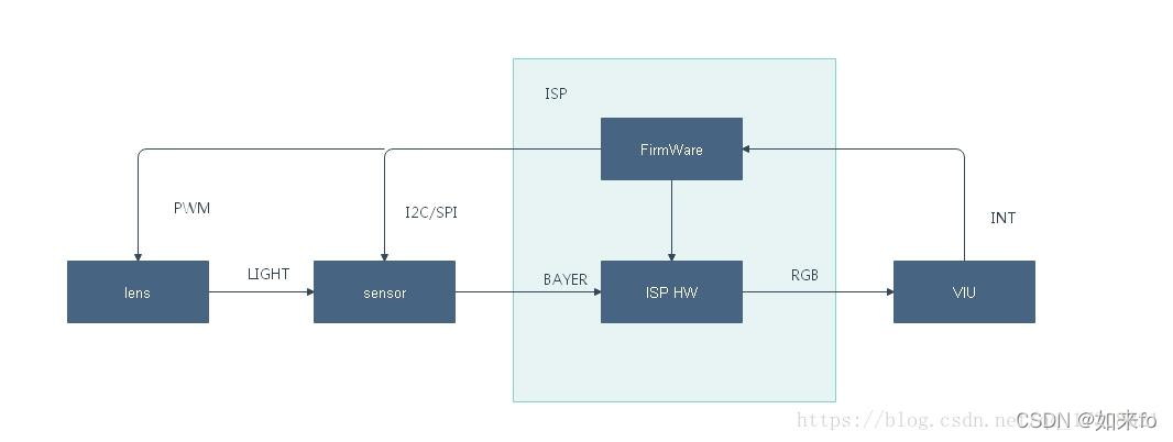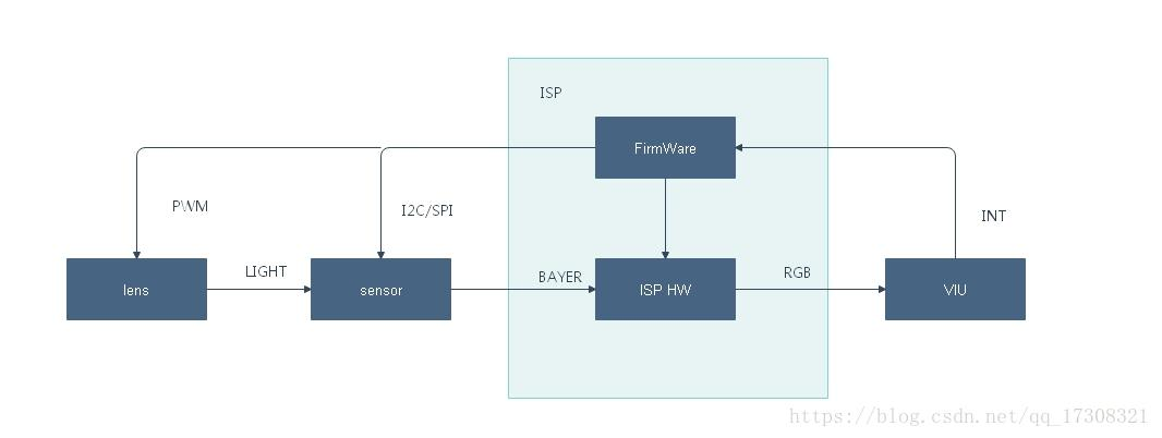 摄像机通过镜头(lens)聚焦光线,将光信号投射到 sensor 的感光区域,sensor经过光电转换,将 Bayer 格式的原始图像送给 ISP(Image Signal Processing 图像信号处理) 经过算法处理,输出 RGB 空间域的图像给后端的视频采集单元。在这个过程中,ISP 通过运行在其上的 firmware 对 lens 和 sensor 进行相应控制,进而完成自动光圈、自动曝光、自动白平衡等功能。其中,firmware 的运转靠视频采集单元的中断驱动。