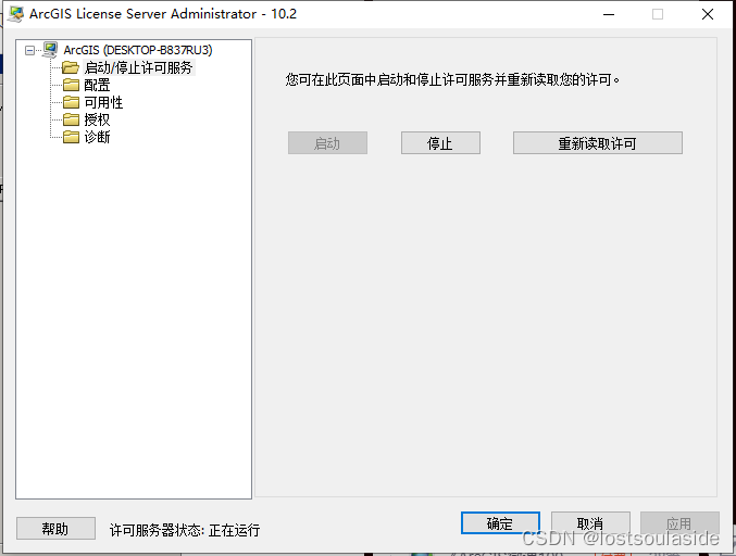 6.开始-ArcGIS-License Server Administrator,点击 启动,重新读取许可,确定