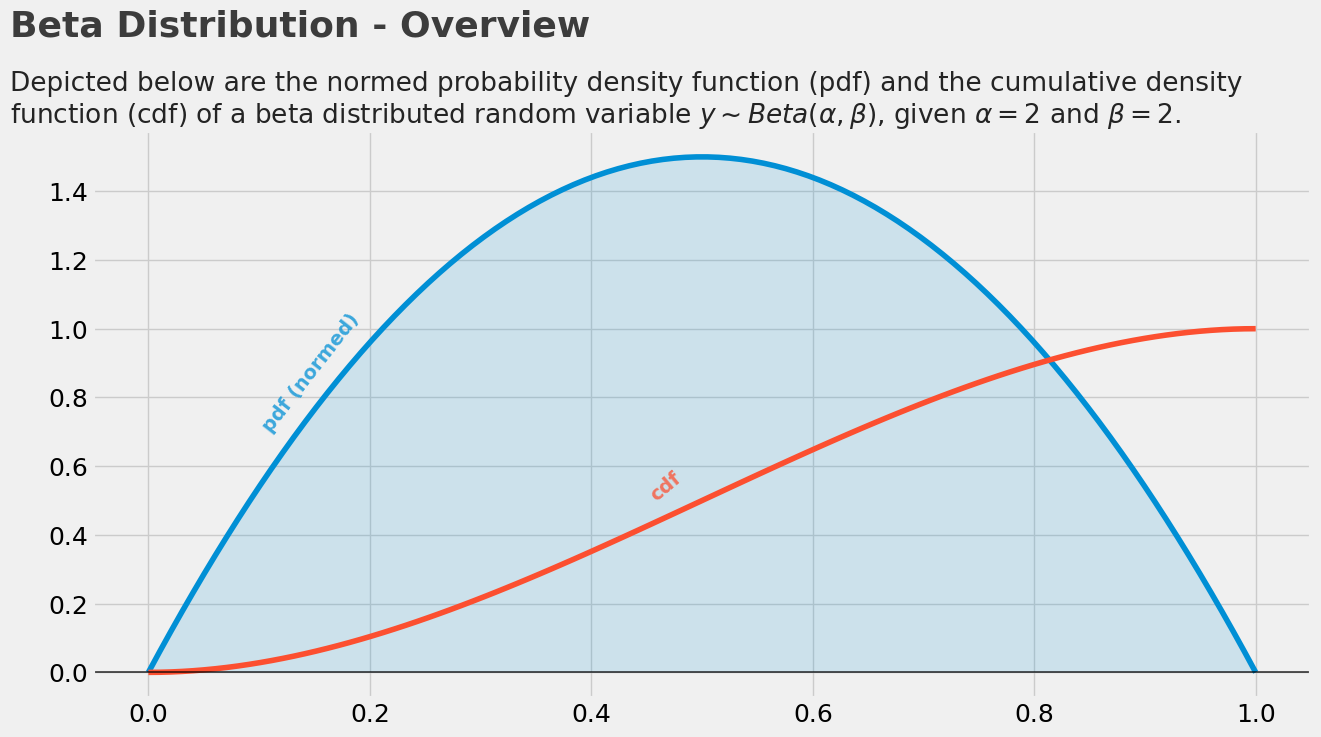 plt.text(x = -.125, y = 1.6, s = 'Depicted below are the normed probability density function (pdf) and the cumulative density\nfunction (cdf) of a beta distributed random variable ' + r'$ y \sim Beta(\alpha, \beta)$, given $ \alpha = 2 $ and $ \beta = 2$.',fontsize = 19, alpha = .85)