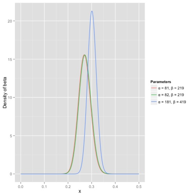 举一个简单的例子,熟悉棒球运动的都知道有一个指标就是棒球击球率(batting average),就是用一个运动员击中的球数除以击球的总数,我们一般认为0.266是正常水平的击球率,而如果击球率高达0.3就被认为是非常优秀的。现在有一个棒球运动员,我们希望能够预测他在这一赛季中的棒球击球率是多少。你可能就会直接计算棒球击球率,用击中的数除以击球数,但是如果这个棒球运动员只打了一次,而且还命中了,那么他就击球率就是100%了,这显然是不合理的,因为根据棒球的历史信息,我们知道这个击球率应该是0.215到0.36之间才对啊。对于这个问题一个最好的方法就是用beta分布,这表示在我们没有看到这个运动员打球之前,我们就有了一个大概的范围。beta分布的定义域是(0,1)这就跟概率的范围是一样的。接下来我们将这些先验信息转换为beta分布的参数,我们知道一个击球率应该是平均0.27左右,而他的范围是0.21到0.35,那么根据这个信息,我们可以取α=81,β=219(击中了81次,未击中219次)