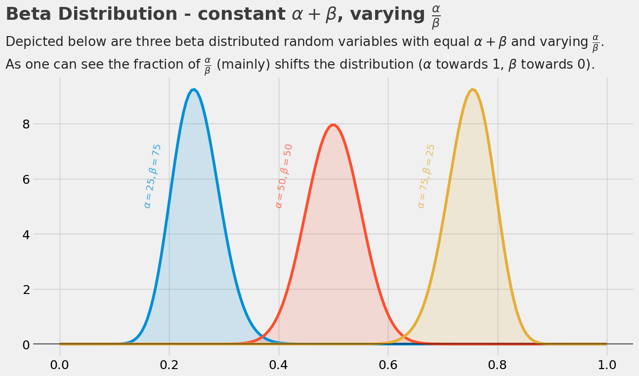 plt.text(x = -.1, y = 10, s = 'Depicted below are three beta distributed random variables with '+ r'equal $\alpha+\beta$ and varying $\frac{\alpha}{\beta} $'+'.\nAs one can see the fraction of ' + r'$\frac{\alpha}{\beta} $ (mainly) shifts the distribution ' + r'($\alpha$ towards 1, $\beta$ towards 0).',fontsize = 19, alpha = .85)