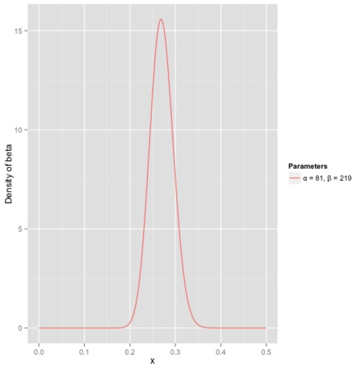 - beta分布的均值是从图中可以看到这个分布主要落在了(0.2,0.35)间,这是从经验中得出的合理的范围。