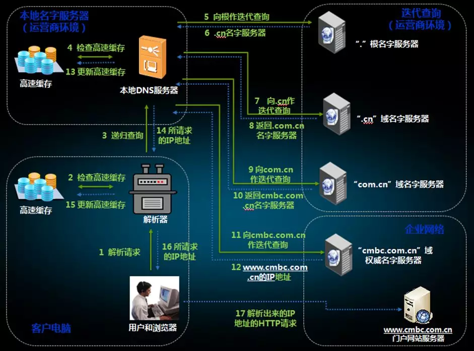 假设后续环节都没有缓存,解析器将 DNS 请求发送给运营商 Local DNS 服务器处理,运营商 Local DNS 依次向 cn.、com.cn.、cmbc.com.cn.域名服务器发起迭代查询,并缓存查询结果,同时将结果返回给用户,实现业务访问。