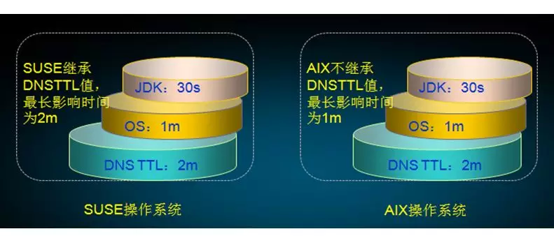 假设操作系统和中间件均开启缓存,场景为应用访问数据库,配置 JDK 缓存 30s,操作系统缓存 1 分钟,DNS 域名 TTL 值为 2 分钟,当 APP 成功访问一次 DB 后,JDK 缓存域名时间为 30s,Suse 操作系统继承 DNS TTL 值缓存域名时间为 2 分钟,当域名发生变化时,JDK 经历 30s 后超时,但是操作系统还未超时,获取到的域名仍然为老地址,导致业务访问不通,影响时间增加 1 分半钟。同样的场景,若操作系统为 AIX,它不认可 DNS TTL 值,缓存为配置的 1 分钟,影响时间仅增加 30s。