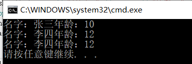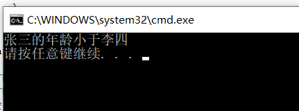 {STU stu1("张三", 10);STU stu2("李四", 12);if (stu1 < stu2) {cout << stu1.getName() << "的年龄小于" << stu2.getName()<<endl;}else{cout << stu1.getName() << "的年龄大于等" << stu2.getName()<<endl;}