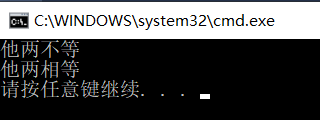 {STU stu("战三",10);STU stu2("战三", 10);if (stu == stu2) {cout << "他两相等" << endl;}else {cout << "他两不等" << endl;}if (stu == "战三") {cout << "他两相等" << endl;}else {cout << "他两不等" << endl;}system("pause");return 0;
