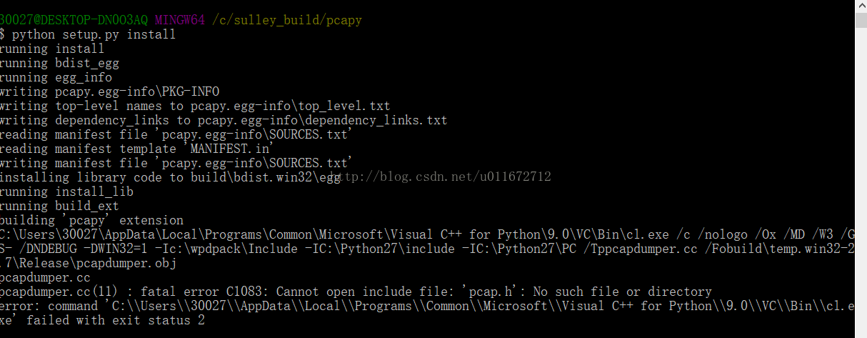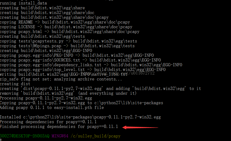 4、按上述方法处理后,再次运行命令 python setup.py install 即可完成 pcapy 模块安装