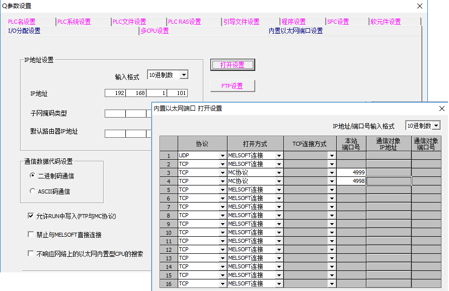首先设置三菱PLC的IP地址、通讯端口和通讯协议,如下图,需要下载后重启PLC才生效。