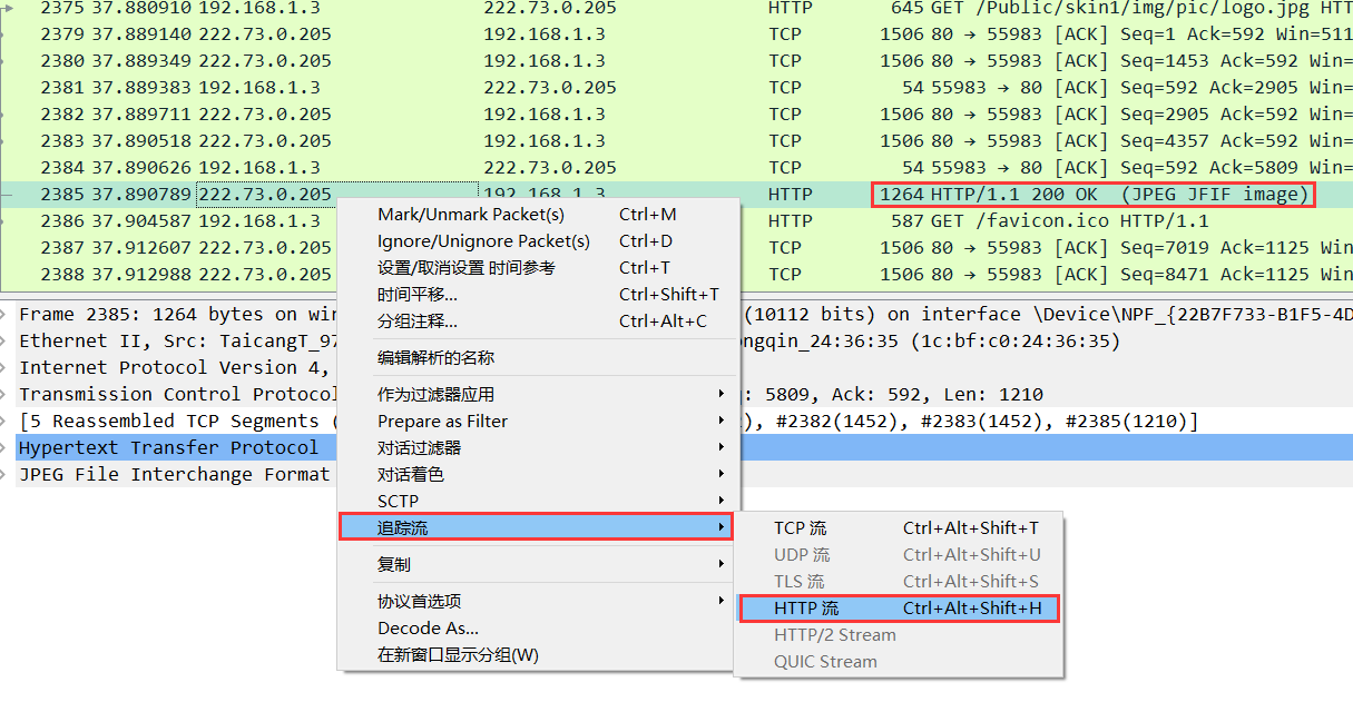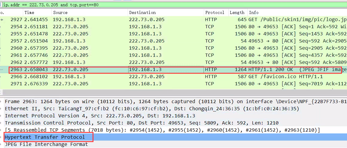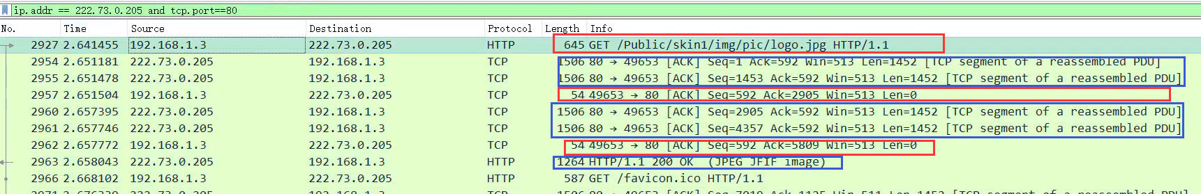 使用对方地址和端口进行筛选ip.addr == 222.73.0.205 and tcp.port==80
