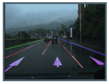 VPGNet:一共20k张图片,包含白天(非雨天、雨天、大雨天)、夜晚的数据,同时包含了各种车道线类型,以及其他不同类型的车道标识(左转箭头、直行箭头、斑马线等等),如下图所示: