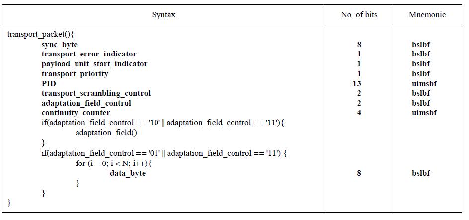 TS包的包头提供关于传输方面的信息:同步、有无差错、有无加扰、PCR(节目参考时钟)等标志。TS包的包头长度不固定,前32比特(4个字节)固定,后面可能跟有自适应字段(适配域)。32个比特(4个字节)是最小包头。包头的结构固定如下: