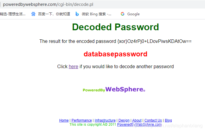 然后我灵机一动,看到上面介绍的 IBM WebSphere Application Server 默认用xor编码保存密码,和题目一联系,似乎可以直接搜索“WebSphere解码”,“WebSphere password”之类的,倒是能找到一个,但是不好使。。