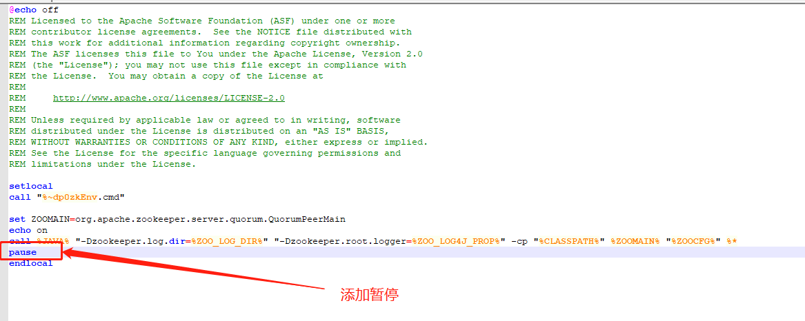 在日常中,经常会遇到一些.cmd文件双击打开的时候闪退的问题,这个时候我们看不到日志也无从看报错信息,因此很难分析问题,这个时候有个小技巧,找一个编辑器,如:Edit等,对cmd文件进行编辑,然后在其代码可能出错的行的下一行,添加pause命令,这个命令是暂停的意思,意思到此处暂停,效果如下图所示: