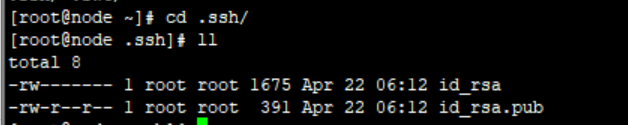 从打印信息中可以看出,私钥id_rsa和公钥id_rsa.pub都已创建成功,并放在 /root/.ssh(隐藏文件夹(以.开头))目录中: