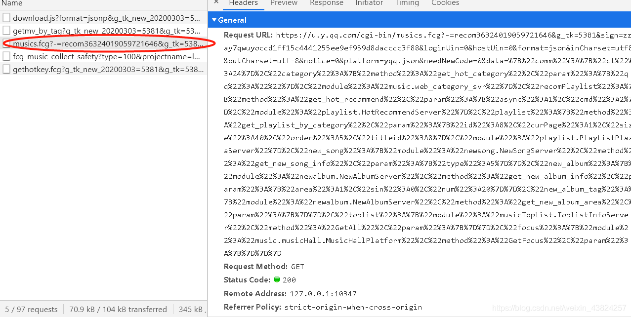 在这个请求的header中,是有服务端referer和origin限制的,所以为了骗过QQ音乐的服务器,我们在我们后台发的请求的header中也要把origin和referer设置成和QQ音乐一样。