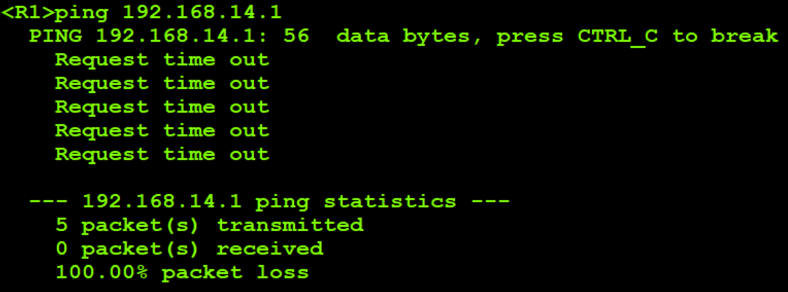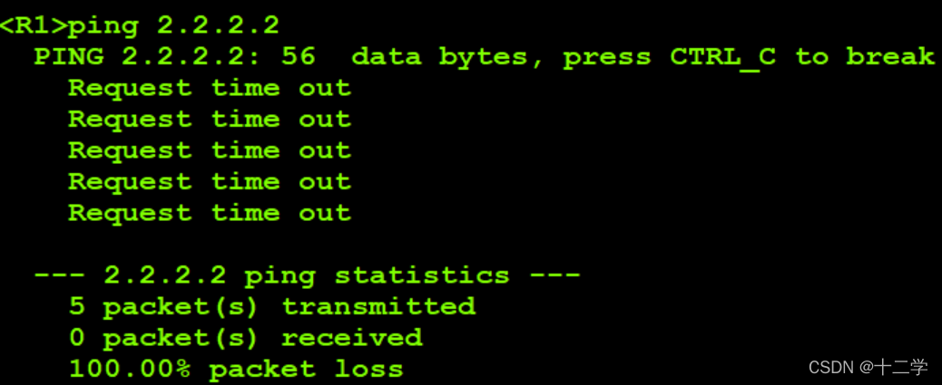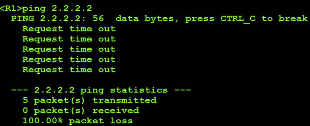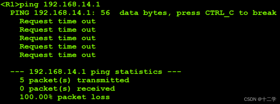 依旧在关闭R2的G0/0/0接口情况下,我们再在R1执行ping命令,看到这两个网段是否依旧连通