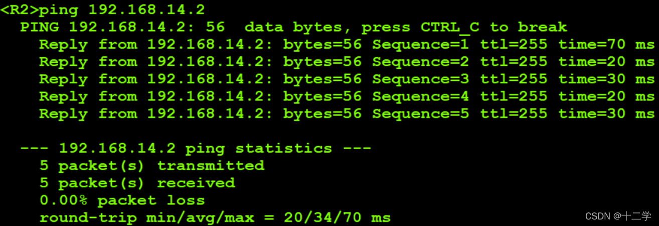 可以看到,刚刚配置的缺省路由已经添加进了R2的路由表中,我们再对该网段执行ping命令
