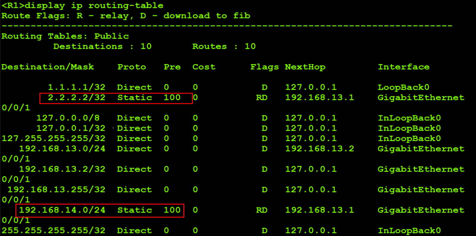 [R1]ip route-static 2.2.2.2 32 192.168.13.1 preference 100