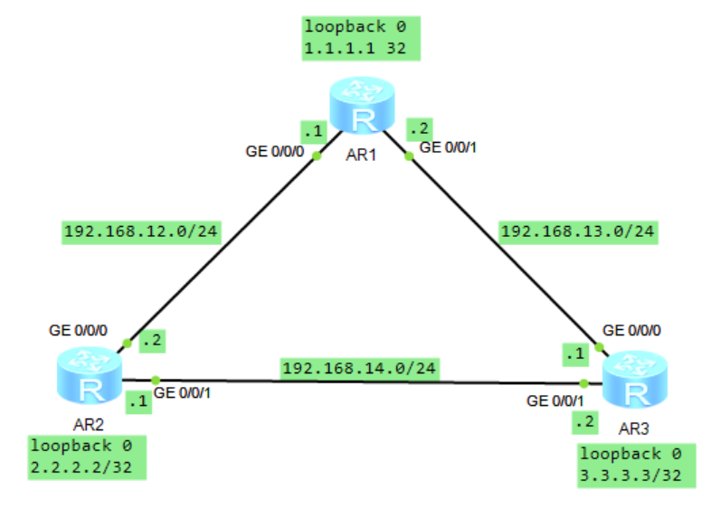 1. 在R1、R2、R3上配置接口ip地址以及回环口地址