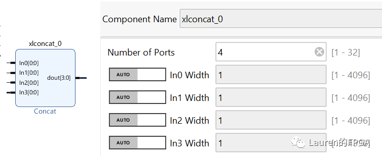 这个IP的实现的就是位拼接的功能,如下图所示。这里要将4个1bit的数据拼接为一个4bit数据。因此,Number of Ports设置为4,输入端口的位宽都设置为1。