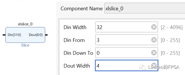 Slice的功能正好和Concat功能相反。该IP是从一个多位宽的数据中提取1位或多位,如下图所示。输入数据是32位,现在从中取低4位,故Din From一栏填3,Din Down To一栏填0,此时Dout Width会自动更新为4。