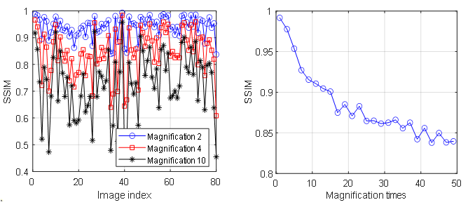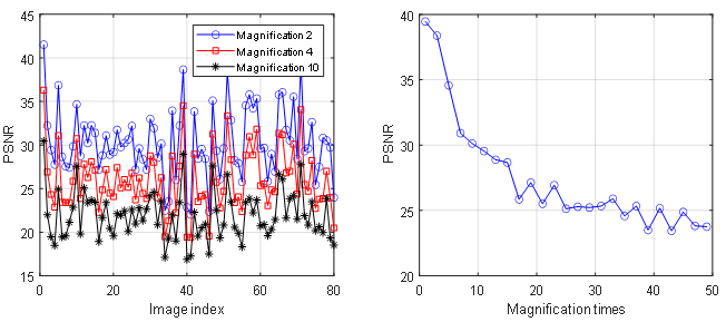 再次,利用MATLAB深度学习工具箱设计了卷积神经网络模型。在设计过程中,利用MATLAB对卷积神经网络的参数进行优化,包括卷积层数、学习速率、卷积核大小和批量大小。通过MATLAB仿真结果,CNN的最佳参数为:学习率为0.05,卷积层数为18,卷积核大小为3*3,批量大小为32。最后,利用IAPR-TC12基准图像数据库对卷积神经网络的性能进行了仿真。并对双三次方法和SRCNN方法进行了比较。仿真结果表明,与传统的双三次和SRCNN方法相比,该方法具有更好的性能和更高的精细度优势。