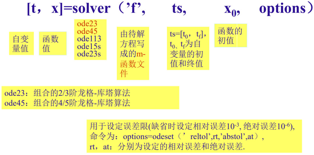 solver 求解器 常用: ode23(运算速度快)、ode45(精度高)最常用。 ode15s(针对 刚性问题) 'f' 或者 @f