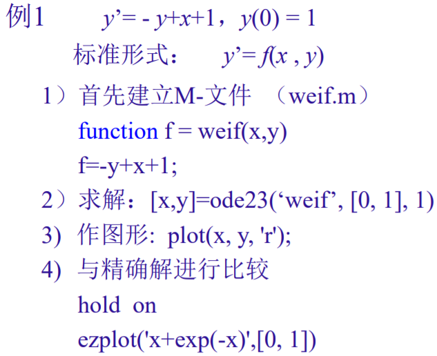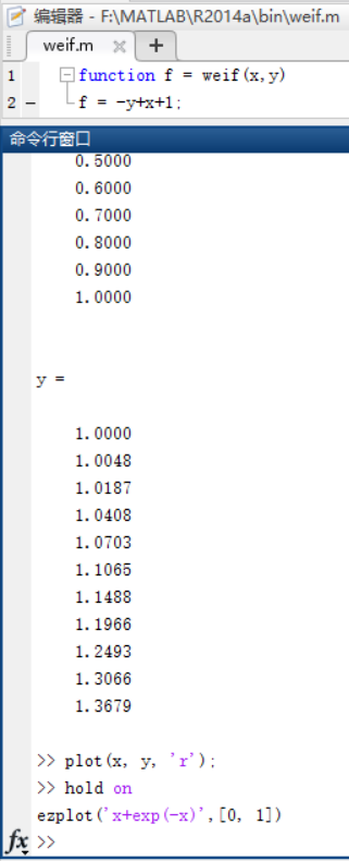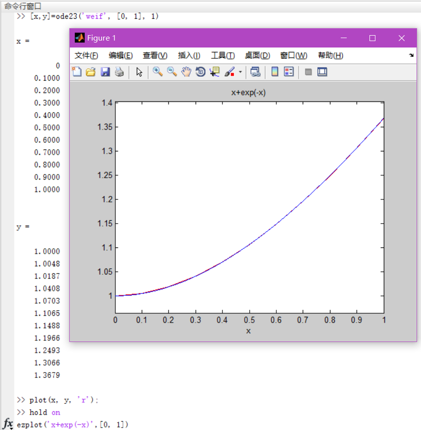 function f = weif(x,y) f = -y+x+1;[x,y]=ode23('weif', [0, 1], 1)plot(x, y, 'r'); hold on ezplot('x+exp(-x)',[0, 1])