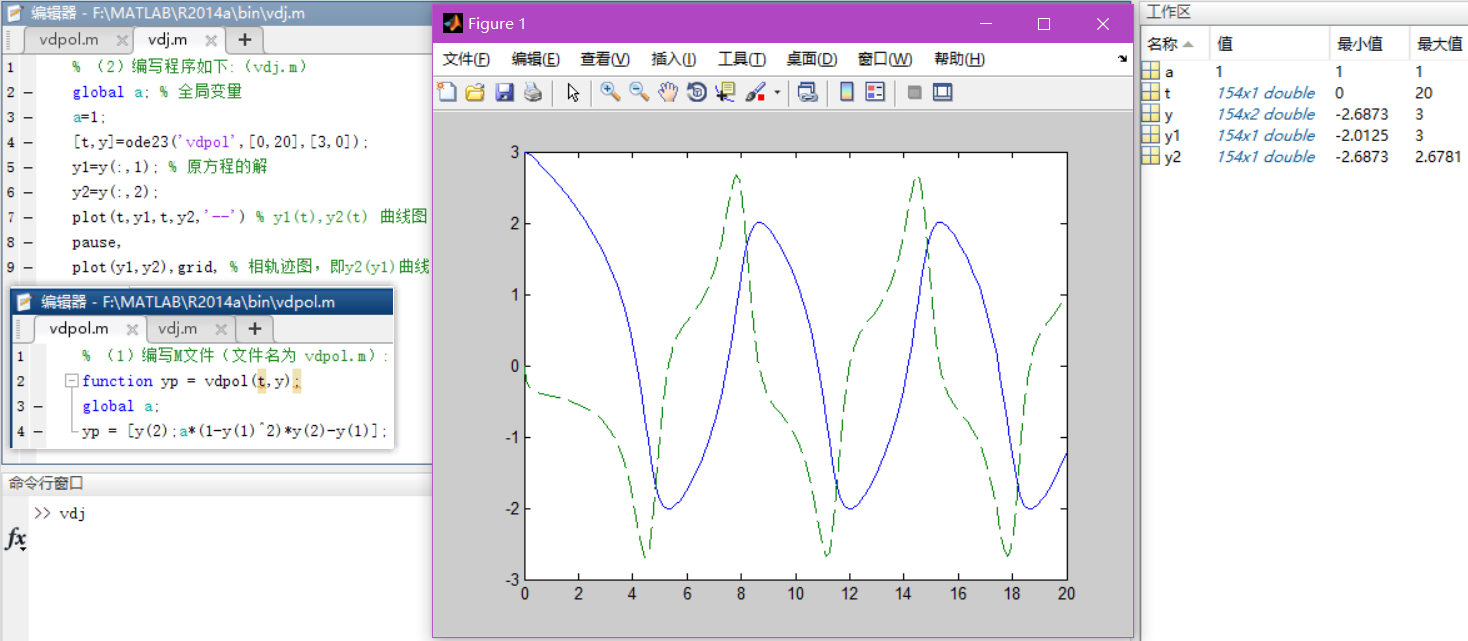 % (1)编写M文件(文件名为 vdpol.m): function yp = vdpol(t,y); global a; yp = [y(2);a*(1-y(1)^2)*y(2)-y(1)];% (2)编写程序如下:(vdj.m) global a; % 全局变量 a=1; [t,y]=ode23('vdpol',[0,20],[3,0]); y1=y(:,1); % 原方程的解 y2=y(:,2); plot(t,y1,t,y2,'--') % y1(t),y2(t) 曲线图 pause, plot(y1,y2),grid, % 相轨迹图,即y2(y1)曲线