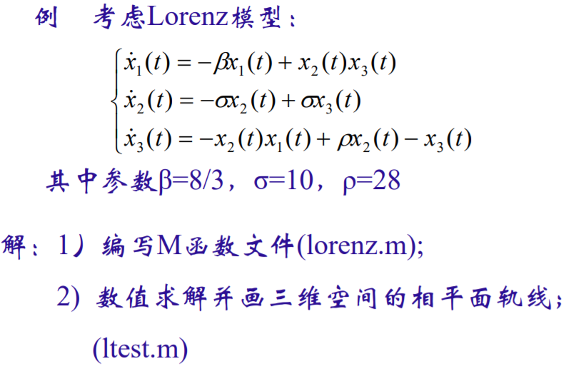 % 1、 lorenz1.m function xdot = lorenz1(t,x) xdot=[-3*(x(1)-x(2))-x(1)*x(3)+26.5*x(1)-x(2)-x(3)+x(2)*x(1)];% 2、ltest.m x0=[0.0 1.0 0]'; [t,x]=ode45('lorenz1',[0,100],x0); % 更改变量区间[0,10] plot(t,x(:,1),'-',t,x(:,2),'*',t,x(:,3),'+') figure; plot3(x(:,1),x(:,2),x(:,3)),grid on