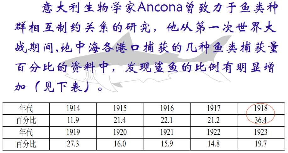 但为何鲨鱼的比例大幅增加呢?生物学家Ancona无法解释这个现象,于是求助于著名的意大利数学家V.Volterra,希望建立一个食饵—捕食系统的数学模型,定量地回答这个问题。