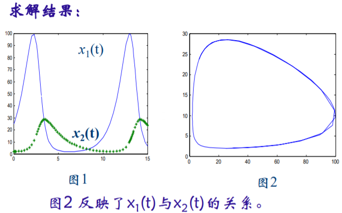 % 1、建立m-文件shier.m如下: function dx=shier(t,x) dx=zeros(2,1); dx(1)=x(1)*(1-0.1*x(2)); dx(2)=x(2)*(-0.5+0.02*x(1));% 2、建立主程序shark.m如下: [t,x]=ode45('shier',[0 15],[25 2]); plot(t,x(:,1),'-',t,x(:,2),'*') figure; plot(x(:,1),x(:,2))