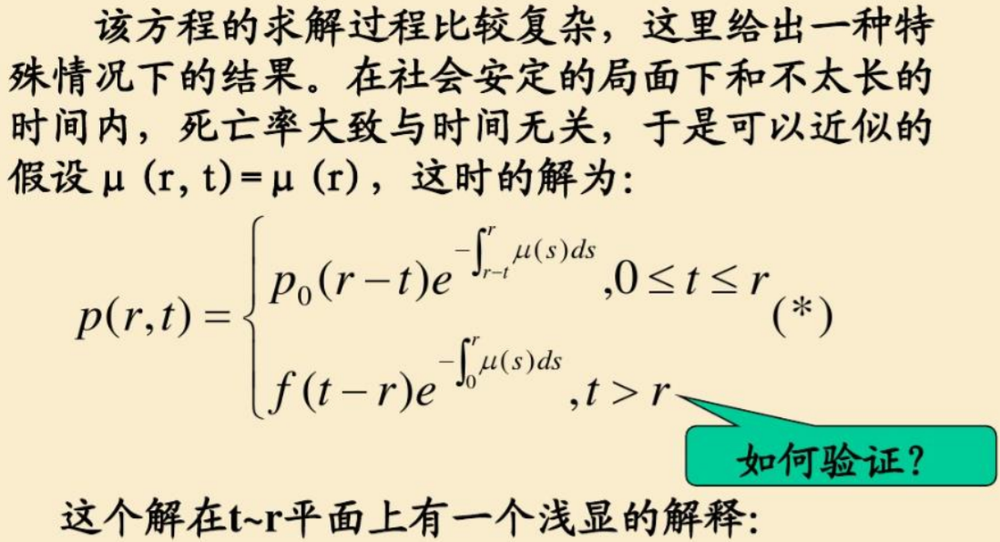 在社会安定的局面下和不太长的时间内,死亡率大致与时间无关,近似假设μ (r, t)=μ (r),死亡率只与年龄有关。