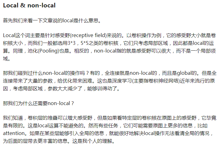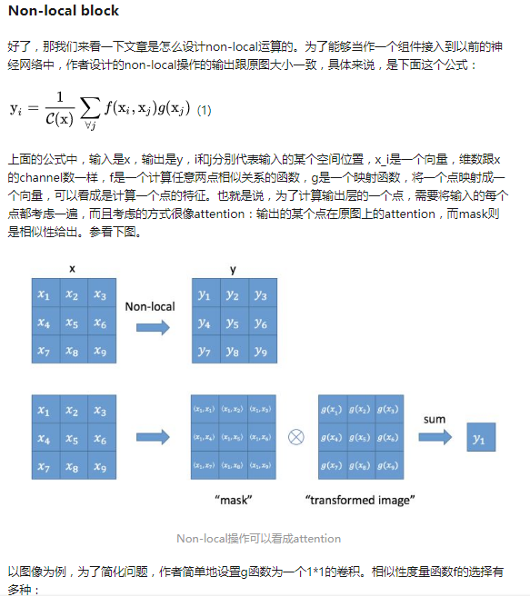 其实non-local就是先计算该点(点为向量,维度是通道数)与其他点(也是向量,维度是通道数)的相似度,对这个相似度进行归一化,得到各个点的权重,这个权重再对应乘以对应点的特征映射值(g(x)),加起来的结果就是当前点的输出yi,这样yi就包含了全局信息,而且利用相似度,相似度其实暗示其他点对这个点的贡献度,这样加权得来,其他点对该点联系越大,相似度越大,那么对yi的影响就越大,这也说明non-local是合理的,其实它这样就与nlp中的注意力机制原理很像,注意其中的联系
