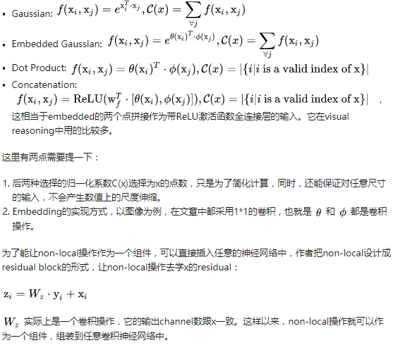 看上面这个图,我们能了解到,其实在这里xi是一个向量,它是维度为通道大小,看那个f,计算相似度,计算的是当前的点与其他点的相似度,由公式(1)看出,输出的一点是该点与其他点的相似度乘以对应其他点的特征加起来所得,其实就是利用相似度当权重,然后加权可得,与全连接很类似,只不过这里对权重进行了规约(即除以C(X)那个操作),其实与我们在NLP中学的注意力机制很像