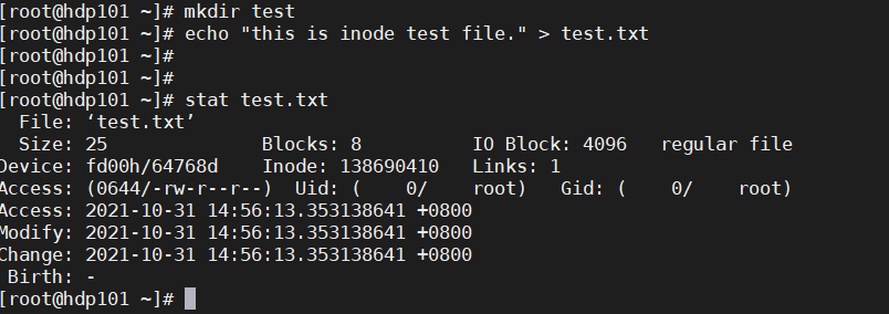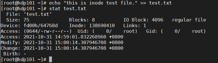 向 test.txt文件中追加内容,查看文件信息,Modify、Change 已经改变