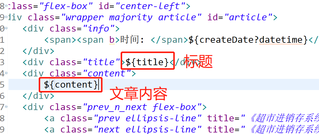 在模板文件中用${字段}把要展示的内容放在固定的位置上,当生成文件后,会自动把操作的对象里面的内容填充在这个位置。字段需与实体类数据库中的表字段一致。