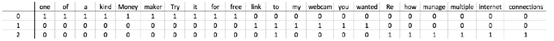 如果我们转换这些数据,使每一列对应于每一个主题行中的每个单词,并将每个单元格的值编码为1,如果给定的主题行有单词,则编码为0,如果没有,则生成的矩阵如下所示: