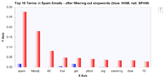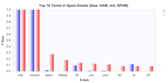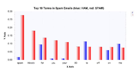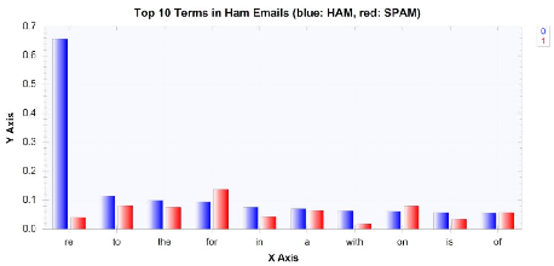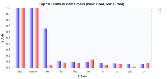 1 var hamTermFrequencies = subjectWordVecDF.Where(2 x => x.Value.GetAs<int>("is_ham") == 13 ).Sum().Sort().Reversed.Where(x => x.Key != "is_ham");4 5 var spamTermFrequencies = subjectWordVecDF.Where(6 x => x.Value.GetAs<int>("is_ham") == 07 ).Sum().Sort().Reversed;8 9 // 查看排名前十的垃圾邮件和非垃圾邮件