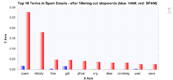 而垃圾邮件的单词分布,在过滤掉来自功能集的数字后,看起来像这样: