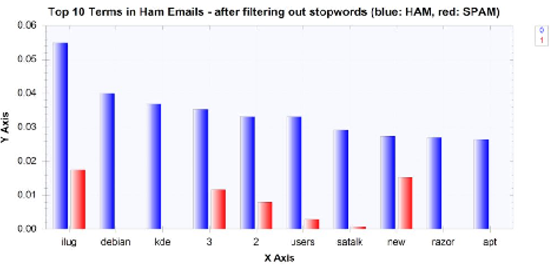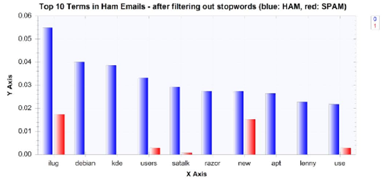 一旦我们从功能集过滤掉这些数字,非垃圾邮件的单词分布如下: