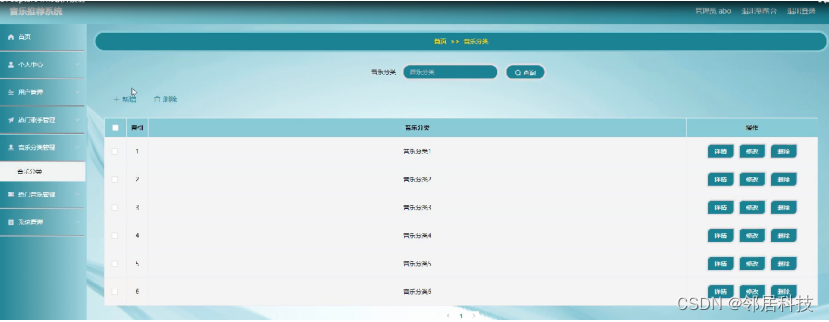 音乐分类管理;在音乐分类管理页面中可以查看音乐分类信息,并进行详情操作;如图5-10所示。